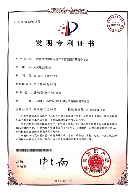 2018年,我司荣获3项由中华人民共和国国家知识产权局颁发的发明专利授权证书,发明名称分别为《一种增深剂及其制备方法》、《一种纺织品后整理用挺弹整理剂及其制备方法、使用方法》、《一种防滑移的核壳型三防整理剂及其制备方法》。