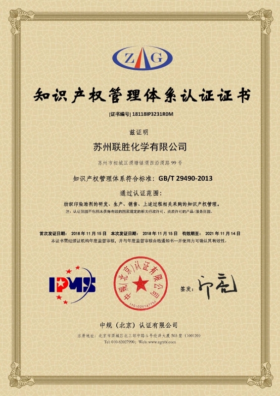 公司于2018年11月15日正式获得由中规(北京)认证有限公司颁发的《知识产权管理体系认证证书》,这标志着公司知识产权管理规范的标准贯穿公司生产、采购、研发、销售、管理等各个环节,在知识产权创造、运用、管理和保护方面全面进入常态化。